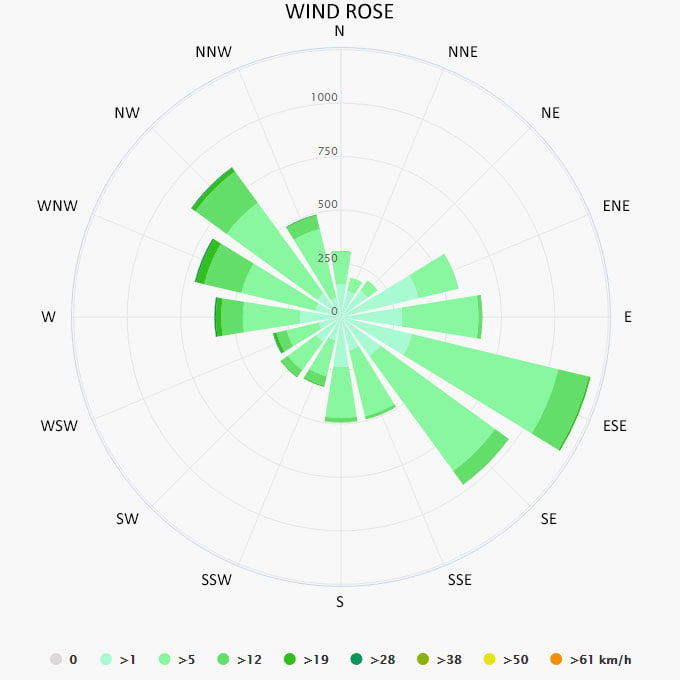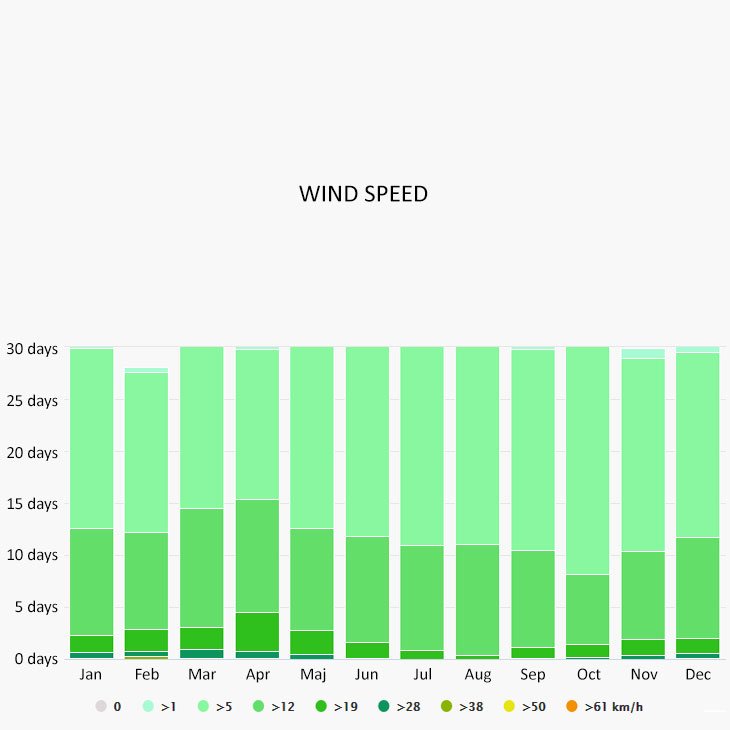 The wind rose for Malaga shows how many hours per year the wind blows from the indicated direction. The diagram for Malaga shows the days per month, during which the wind reaches a certain speed.