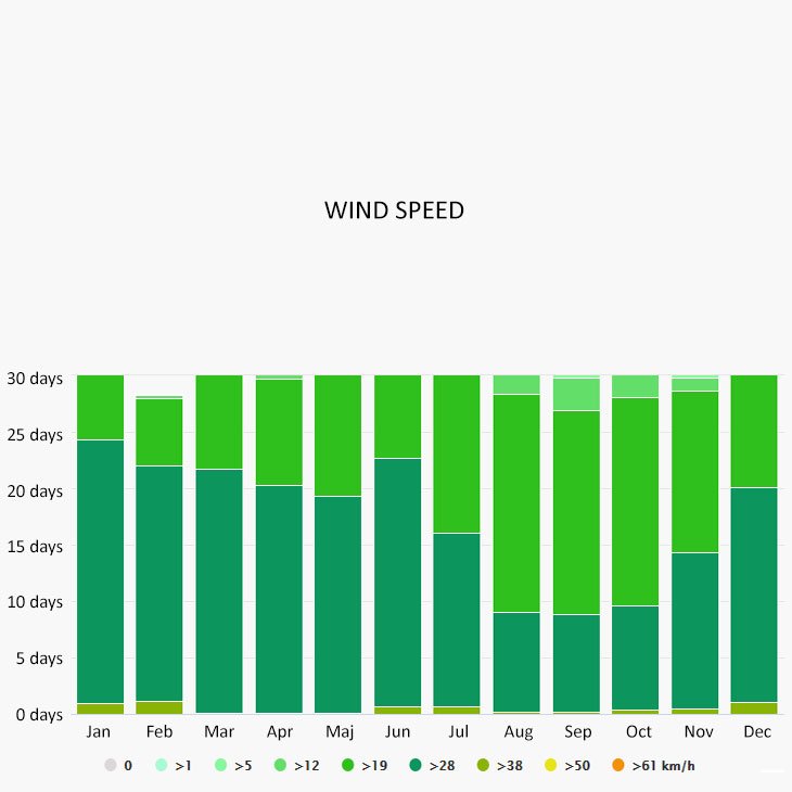 The wind rose for Grenada shows how many hours per year the wind blows from the indicated direction. The diagram for Grenada shows the days per month, during which the wind reaches a certain speed.