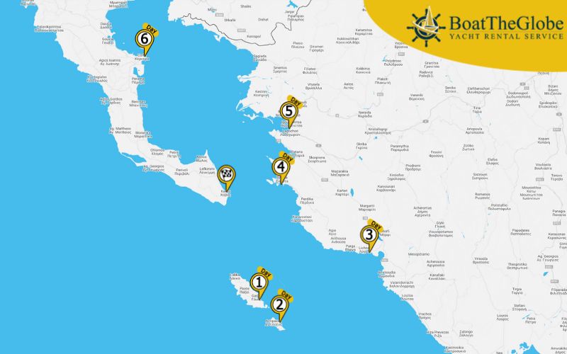 Day 1. Corfu Town – Kassiopi (20 km / 11 nm), Day 2. Kassiopi – Avlaki (10 km / 5.5 nm), Day 3. Avlaki – Agios Stefanos (12 km / 6.5 nm), Day 4. Agios Stefanos – Paleokastritsa (15 km / 8 nm), Day 5. Paleokastritsa – Liapades (5 km / 3 nm), Day 6. Liapades – Barbati (59,5 km / 37 nm), Day 7. Barbati – Corfu Town (20 km / 11 nm)