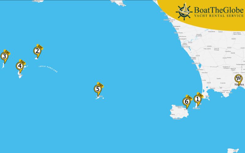 Day 1. Naples – Procida 26,28 km (16,33 nm), Day 2. Procida – Ventotene 22,99 km (14,29 nm), Day 3. Ventotene – Ischia 7,63 km (4,74 nm), Day 4. Ischia – Capri 31,47 km (19,55 nm), Day 5. Capri – Amalfi 32,97 km (20,49 nm), Day 6. Amalfi – Positano 12,60 km (7,83 nm), Day 7. Positano – Naples 28,07 km (17,44 nm)