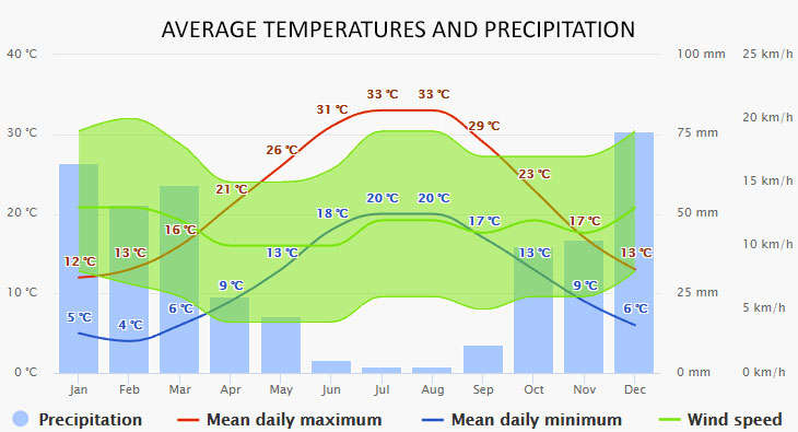 The climate diagrams are based on 30 years of hourly weather model simulations. They give good indications of typical climate patterns and expected conditions (temperature, precipitation, sunshine, and wind). The “mean daily maximum” (solid red line) shows the maximum temperature of an average day for every month for Skiathos. Likewise, the “mean daily minimum” (solid blue line) shows the average minimum temperature.