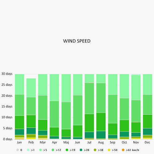 The wind rose for Skiathos shows how many hours per year the wind blows from the indicated direction. The diagram for Skiathos shows the days per month, during which the wind reaches a certain speed.